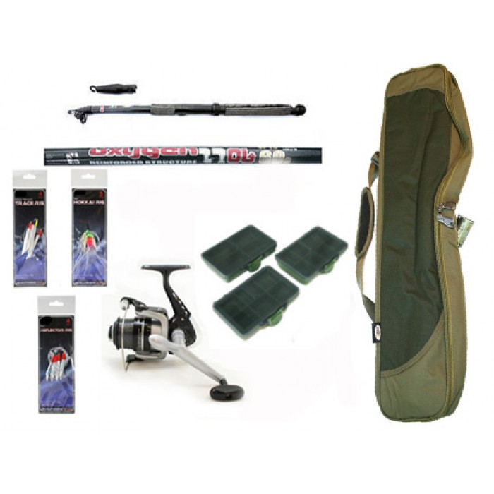 This fishing starter kit is ideal for travelling, holidays, beginners, kids or just to keep in the boot of your car. Now comprising of a 2.4m Oxygen carbon concept telescopic rod, a fixed spool reel ready loaded with line, 3 x multi compartment bit boxes, 3 packs of attractor lures, and a 82cm travel bag which is big enough for the rod, reel, and plenty of tackle too. Ideal for both light sea and freshwater fishing. The rod holdall is well made with a carry handle, a padded shoulder strap. It has a twin zip system and there are also velcro straps inside to strap your rod down into.